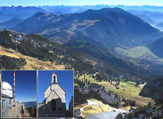 Mal anders gesehen: Das Sudelfeld (Bildmitte) vom Wendelstein aus - im Hintergrund geht der Blick bis in die Venediger-, Tauern- und Zillertaler-Region; rechts die Ortschaft Bayrischzell und eine Sudelfeldschleife (kleine Fotos: Wetterstation und Gipfelkapelle)