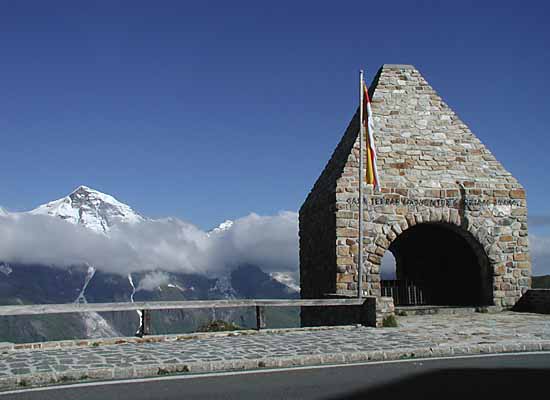 Das Fuscher Törl ist ein Gedenkstätte zu Erhren der beim Bau der Straße tödlich verunglückten Arbeiter; links davon das Große Wiesbachhorn (3564 m)