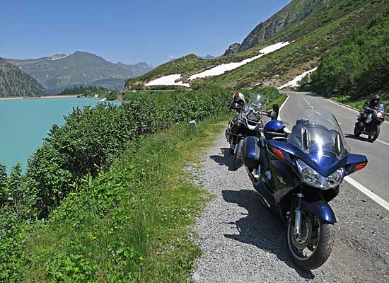 Lässig gestaltet sich die Fahrt entlang des Vermuntstausees; links im Bild die Staumauer.