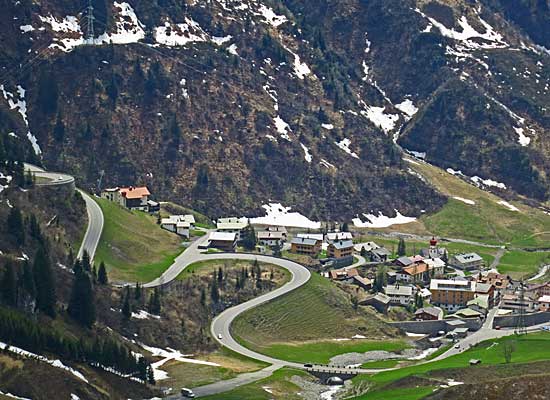 Blick hinunter zur Ortschaft Stuben mit den ersten Kehren zum Arlbergpass