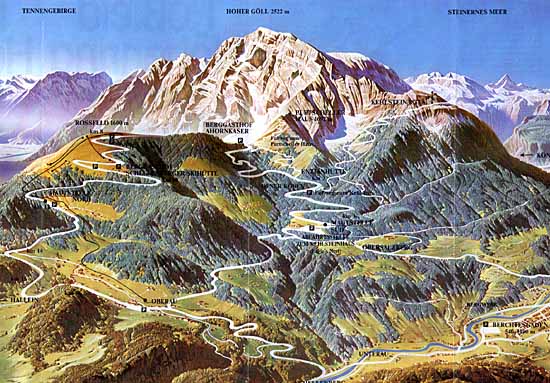Panoramazeichnung der Ringstraße: rechts unten liegt Berchtesgaden, hinten erkennt man das Tennengebirge, den Berg "Hoher Göll" und das Steinerne Meer