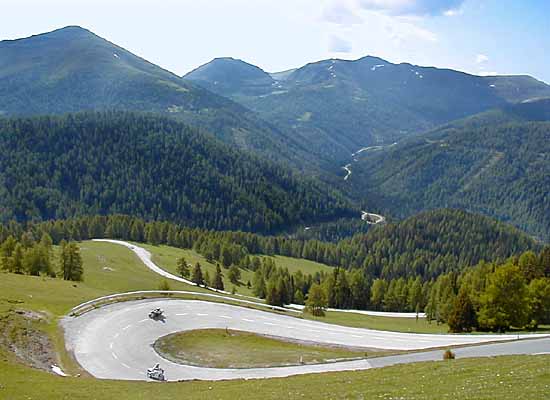 Zwischen den beiden Pässen Eisentalhöhe (2042 m) und Schiestlscharte (2024 m) durchfährt man in vielen Kehren die eigentliche Alm. Deutlich sind hier die "Nockn"-berge zu sehen