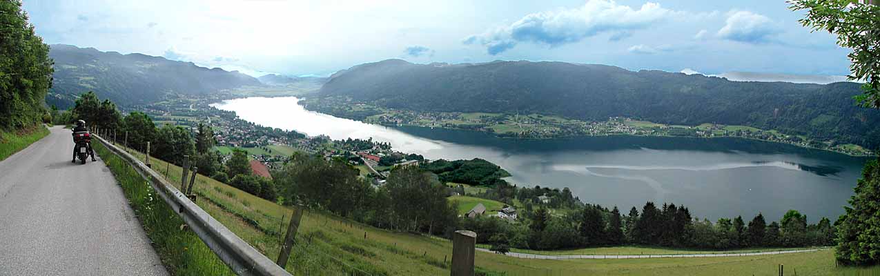 Sie südliche Alpenstraße verwöhnt mit immer wieder tollen Ausblicken auf den Ossiacher See und die in der nahen Ferne liegenden Karawanken