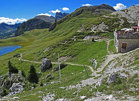Auf jeden Fall sollte man aber einen Cappuccino auf der Terrasse des Rifugio Valparola und die Aussicht geniessen
