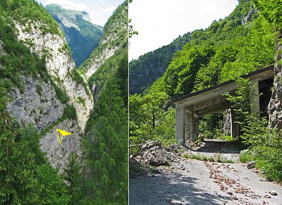 Von der alten Straße durch die Lumieischlucht sind nur mehr Teile erhalten (Pfeil).