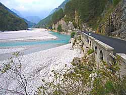 Zwischen Bárcis am gleichnamigen See im Norden und Aviano im Südosten führt eine 'Strada Touristica' in ein erst in den letzten Jahren erschlossenes Skigebiet am Monte Cavallo. Im Norden ist diese nicht immer gut ausgebaut, nach Aviano jedoch geht's in vielen Kehren auf breiter Straße bergab. Fahrerisch sind beide Rampen interessant, aussichtsreicher ist jedoch die südöstliche. Hinweis: eine Fahrt durch die weiter östlich fast parallel dazu verlaufende Cellinaschlucht ist nicht mehr möglich. Erst nordwestlich des Lago di Bárcis kann man weniger spektakulär dem Cellina-Fluß folgen (kl. Bild). Fotos: aufgenommen September 2004 |