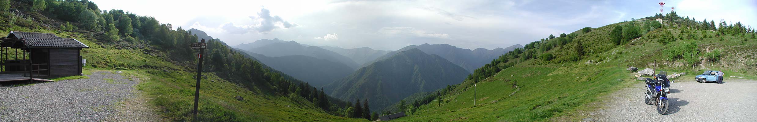 Einer der Aussichtsplätze auf dem Scheitel der Panoramica Zenga. Während der Blick im Süden hinunter in Biella-Ebene führt, kann man im Norden bei guter Sicht (!) den zweithöchsten Berg der Alpen bestaunen: den an der Grenze zur Schweiz und nicht allzu weit vom Matterhorn (bzw. ital. Cervino) entfernt gelegenen Monte Rosa (4637 m)
