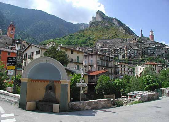 Die Häuser des Ortes Tende hängen wie angeklebt in den Berghängen.