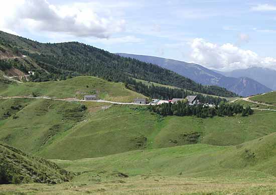 Eher Alm- als Hochalpencharakter hat die Passhöhe des beliebten Croce-Domínii-Passes. Links im Bild der Anstieg der nur geschotterten Verbindung zum Maniva-Pass über den Giogo della Bala und Goletto delle Crocette