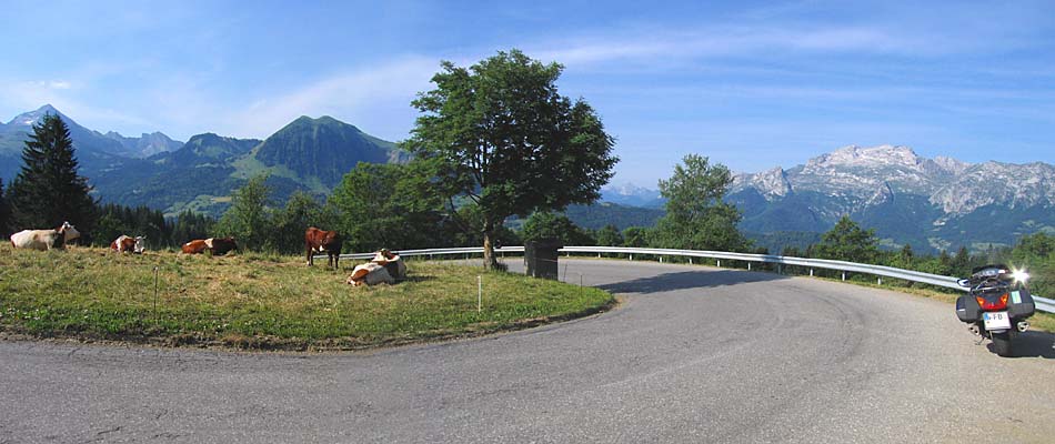 Kehre auf der Westrampe: die Kühe schauen gelangweilt auf den 'La Tournette' und verstehen nicht, warum hier ein deutscher Biker stehen bleiben muss und ihre Mittagsruhe stört, nur um ein Foto zu schießen.