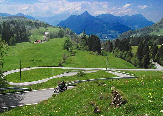 Traumhafte Kurven mit Blick auf immerhin schon an die 2000 Meter hohe Berge (die hier in der Region meist nicht -berg, sondern -stock heissen)