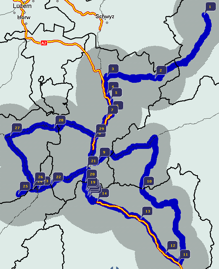 Start (1): Glarus/Restaurant 'Route 66' (1) - Klausenpass (2) - Schöllenen-Schlucht (8-9) - Lukmanier-Pass (10) - St.-Gotthard mit Tremola/Tal des Zitterns (19/20) - Furkapass (22) - Grimselpass (24/26) - Oberaarsee (25) - Sustenpass (28) - Ziel: Wassen (29)