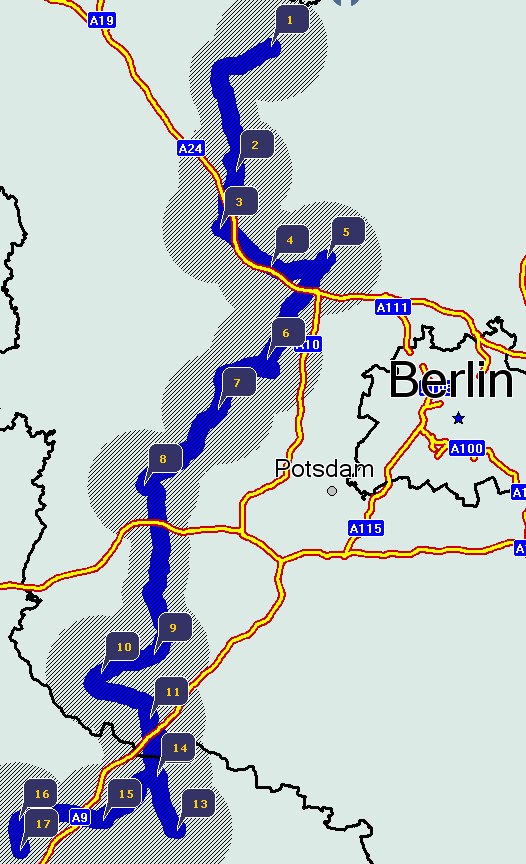 Start: Rheinsberg (1); Ziel: Dessau (17) über Brandenburg (8) und Lutherstadt Wittenberg (13)