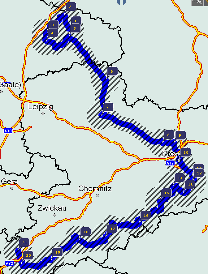 Start: Lutherstadt Wittenberg (1); Ziel: Plauen (21) über Dresden (10) und Erzgebirge (13-19)